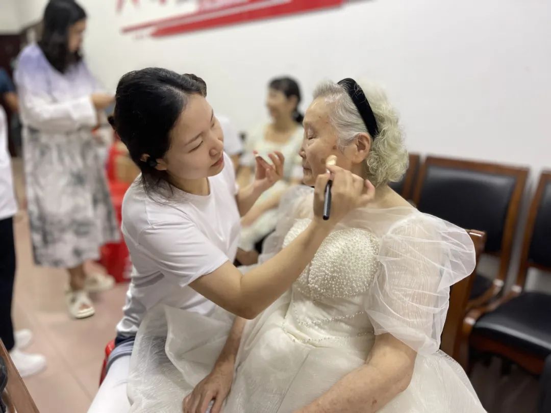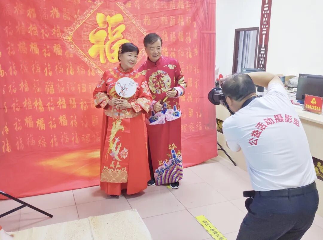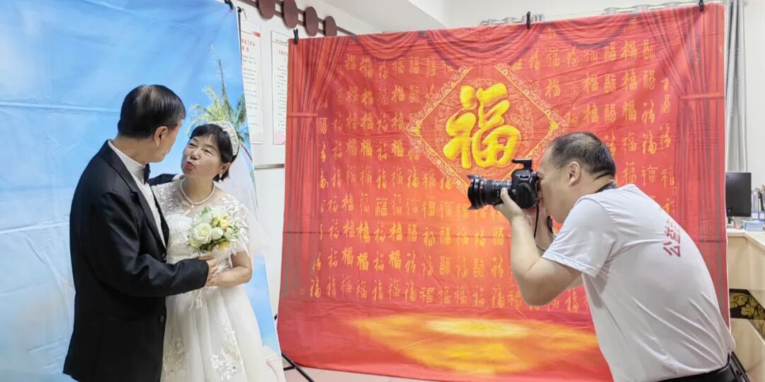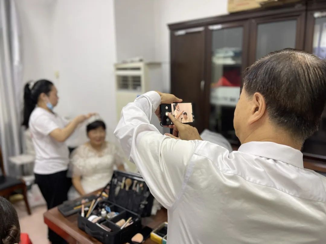 当七十多岁的梅师傅第一次见到老伴穿上婚纱的样子,激动地流下了眼泪,他直言年轻时候由于条件有限,环境艰苦,没有拍上像样的结婚照,十分感谢社区提供的这次机会,让他们老年生活幸福感爆棚。