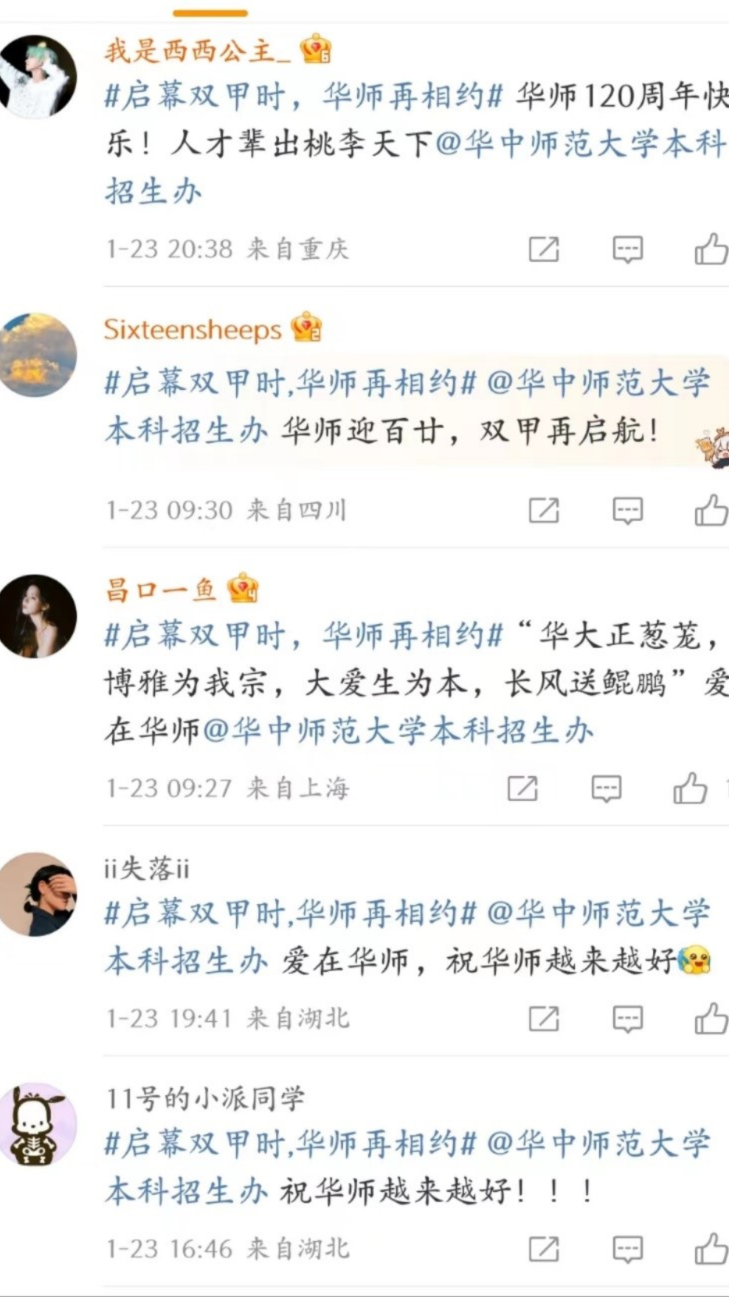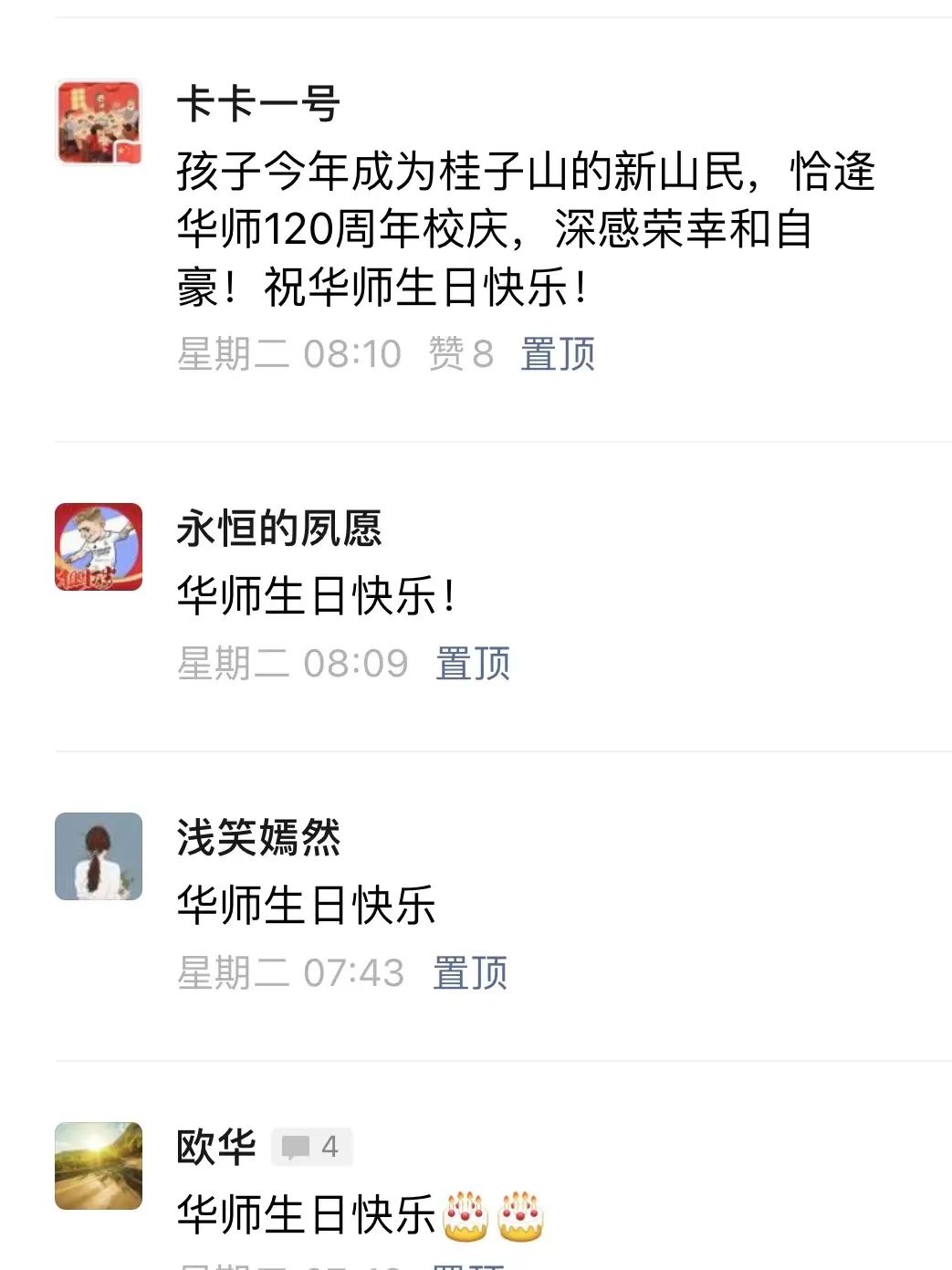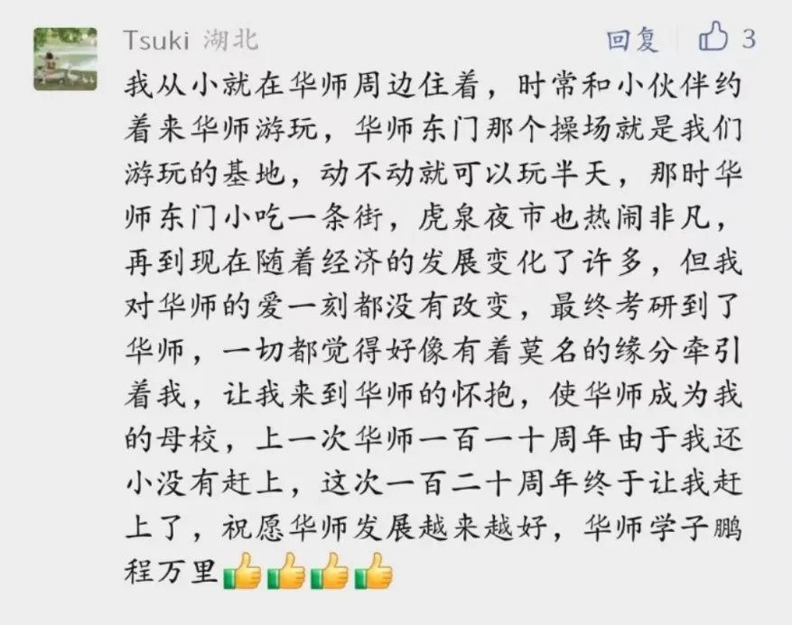 120年,我看到了追求卓越的精神、深厚的治学传统和优良的学风在华师代代相传。祝母校生日快乐,为祖国培养更多人才。我也会一直铭记华师精神,用实际行动践行华师精神。