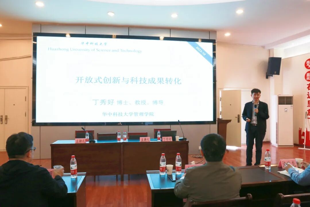 此次培训班特邀请华中科技大学管理学院教授、创新创业与知识产权系副系主任丁秀好,以《开放式创新与科技成果转化》为主题为大家讲解创新创业相关知识。