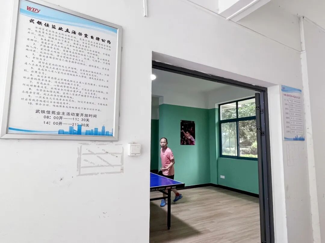 “反抽!好球!”周末的午后,一阵阵欢呼声从武汉市洪山区梨园街道武铁佳苑社区19栋楼的架空层传来,新建的共享乒乓球室里正进行着一场友谊赛,小区居民看得好不热闹。