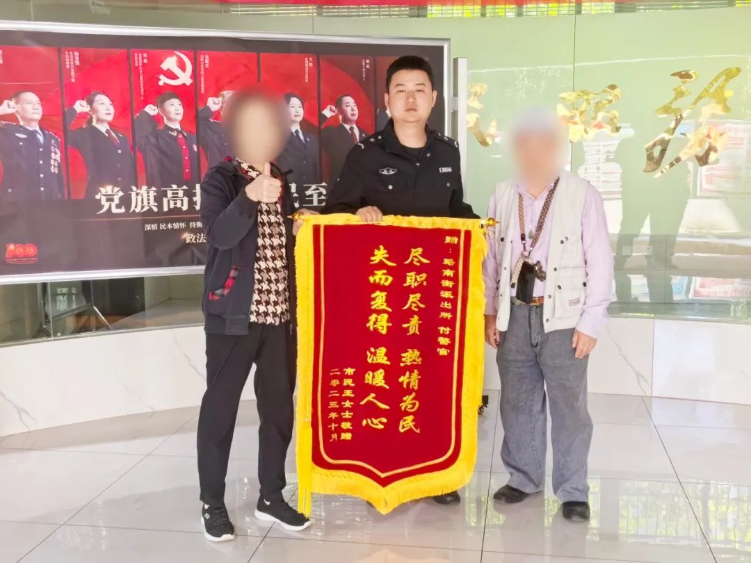 10月26日上午10时许,张爹爹和其老伴带着印有“尽职尽责 热情为民 失而复得 温暖人心”的鲜红锦旗来到派出所,感谢民警的帮助。