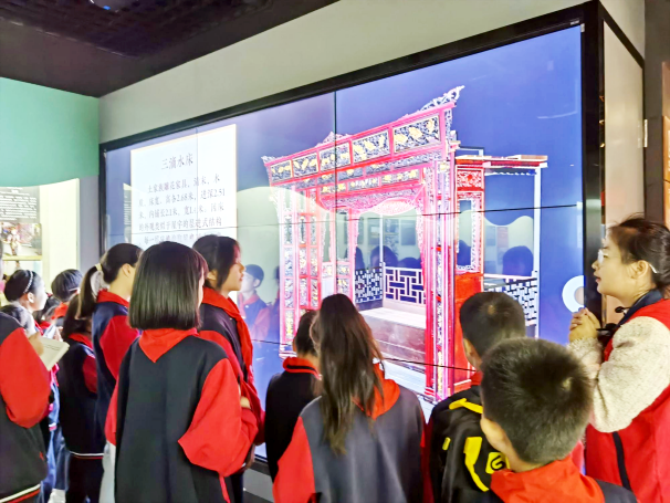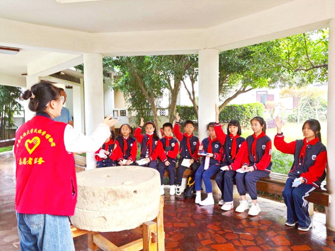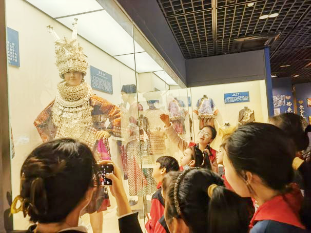 当天,伴随着讲解员的生动讲解,大家一起走过了《美美与共》《记忆武陵》《工艺奇葩》《椰风海韵》《锦上添花》《枫香树下》《斑斓霓裳》等7个展厅,领略了各民族丰富多彩的传统文化和风俗民情。虚拟现实、交互体验等现代化展示方式,多角度全方位展现了中华文化共同性、各民族交往交流交融的历史事实。参观结束后,同学们与讲解员进行民族文化知识问答、民族故事分享。