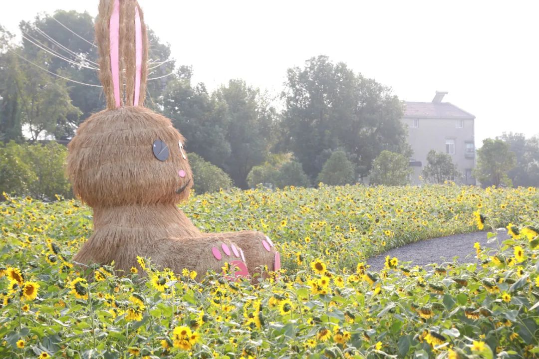 10月31日,武钢云谷·606产业园门前,一望无际的明黄绚丽又张扬,仔细看,是8300平方米的向日葵迎风招展,形成了一片金色的海洋。花海里坐着一只硕大的“稻草兔”,沿着碎石铺就的小径行走于向日葵花丛间,像是穿越到了梵高的油画里。