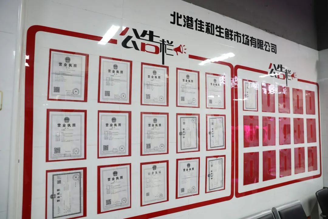 据介绍,佳和生鲜市场此前进行了2.0升级改造。走进市场内,除了常规的硬件设施提档升级,首先映入眼帘的就是一面证照公示墙,可以清楚直观地看到市场内所有经营户的证照。在一旁还专门设立了透明幕墙式的“农残留快检室”。作为改造重点,市场内公厕入口处安装了防蝇帘,张贴了“六步洗手法”,配备了洗手液,并由市场方安排专人负责公厕的每日清洗消杀工作,及时保洁,做到公厕内无蝇无臭。