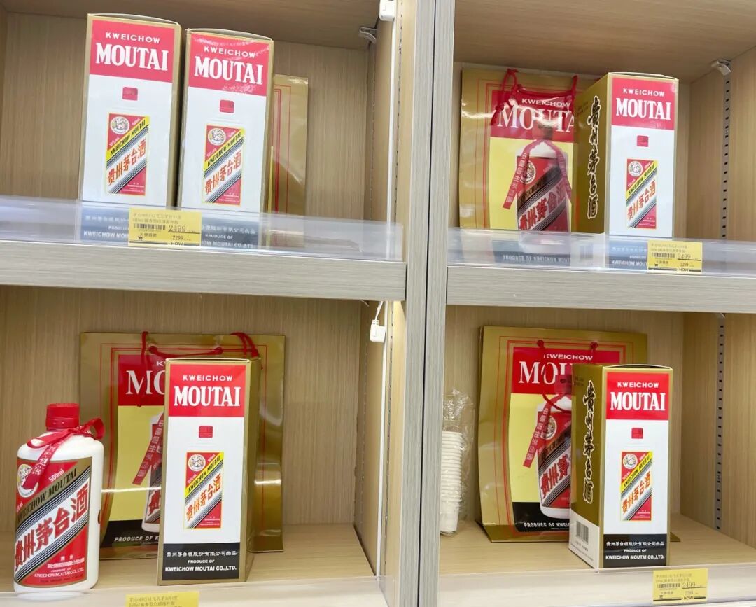 正对大门,走到底的一面墙,陈列的全是茅台,标签上写的是“飞天茅台53°500ml酱香型白酒海外版”。注意!这是一款海外版茅台。店长介绍,该店在售的白酒类仅此一款,原价2499元,现优惠价2299元。开业至今,已售100多瓶,“每天销售,必有一瓶茅台。”后续,该店还会上新一些红酒、气泡酒。