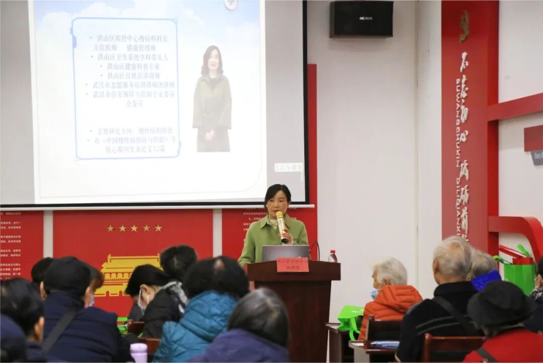 “糖尿病是一种以高血糖为特征的代谢性疾病,由其诱发的冠心病、脑卒中及糖尿病肾病、糖尿病视网膜病变、糖尿病足等并发症是我国居民致死、致残、致盲的重要原因。因为并发症的隐蔽性,易被忽视。”洪山区疾病预防控制中心慢病科主任医师姚建渝以“控制糖尿病、享受健康生活”为主题进行宣讲,用通俗易懂的方式,讲解了血糖生成的原理、食物对血糖波动的影响,以及对糖尿病的预防和管理。