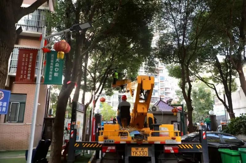 修剪开始前,社区工作人员提前通知树木附近停放车辆的车主移车,并在树木周围拉起警戒线。活动当天,公园管理中心党员干部职工使用大型升降机、油锯、枝剪、手锯、大挎剪等专业修剪工具,对妨碍交通、影响采光、有安全隐患的树木进行精细修剪。修剪完成后用最快的速度将枯枝、树叶清理干净,保证行人和车辆安全通行。