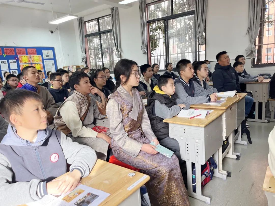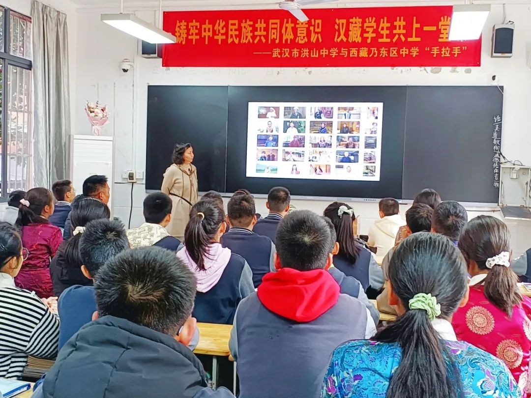 10名来自西藏乃东区中学的藏族青少年走进武汉市洪山中学八(7)班,和同学们一起聆听“传承民族非遗文化 铸牢中华民族共同体意识”主题思政课。