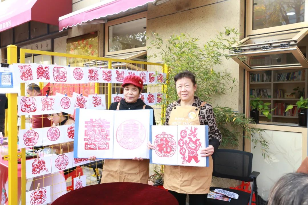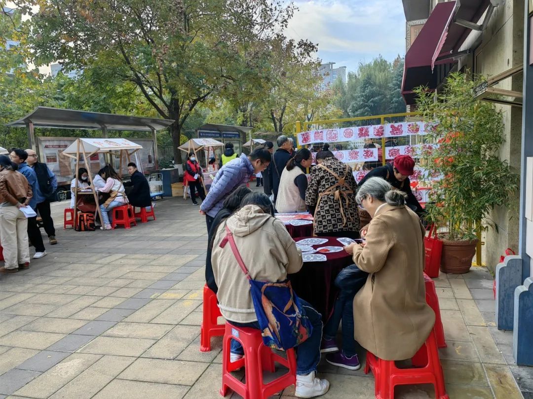 在剪纸摊位的圆桌旁,三位阿姨拿着模板认真地进行剪纸创作;一旁的书画摊位则晒出了各类“扇”解人意的书画作品;非遗捏面人的摊位前,居民“学徒”手里的玫瑰花也初具雏形......
