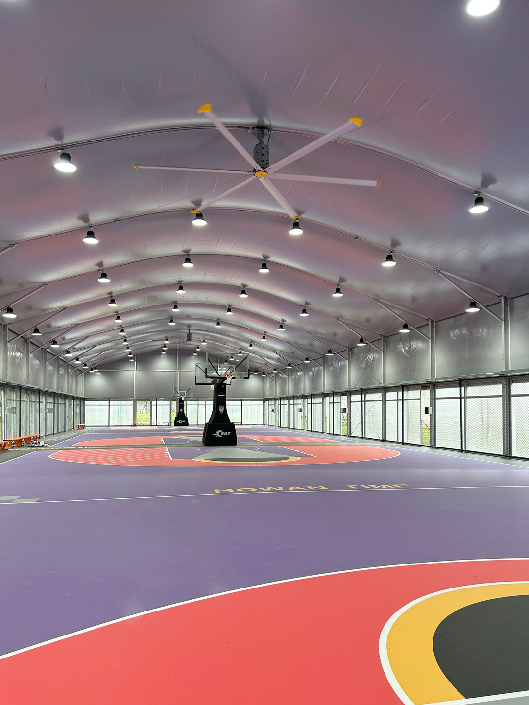 篮球馆内布局有2片篮球标准全场、1片篮球标准半场,地面采用8mm新型硅PU材质,防滑减震。采用“互联网+”、智能化、数字化运营模式,场馆实现集成智能灯光系统、视频系统、入口管理系统,联通物联网、互联网等实现全智能化运行。