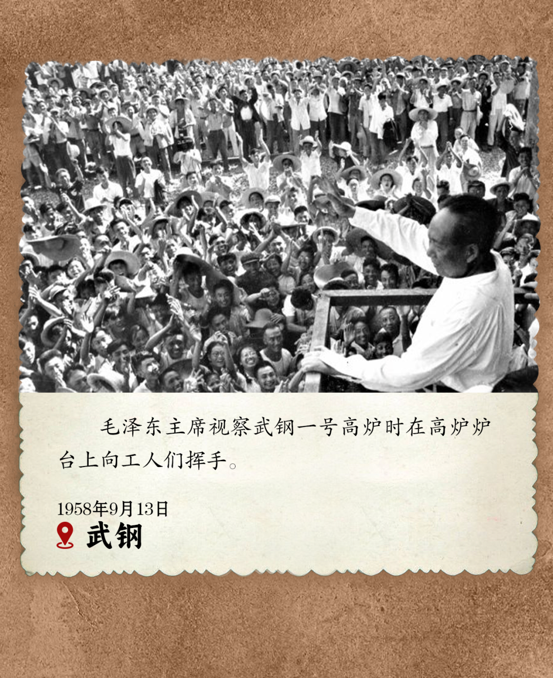 来到武钢后,毛泽东向翘首以盼的职工们招手,然后登上高炉旁临时设立的小平台。炉内喷出了火花,铁水喷涌而出。台上台下响起一片欢呼,火光映红了毛泽东的笑脸。