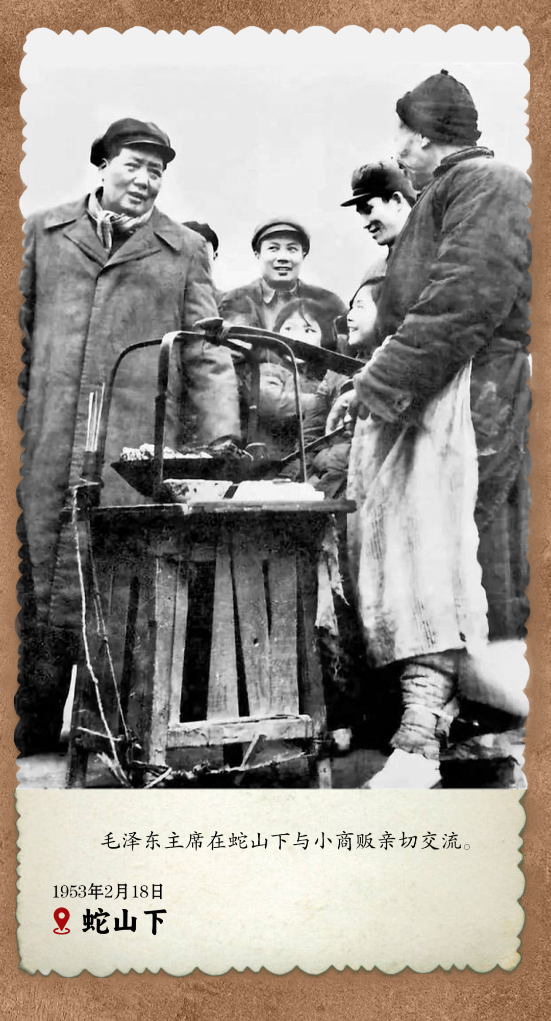 他经常外出深入工厂、矿山、学校、农村、机关,进行调查研究。为了解基层商业公私合营后的情况,他和一位女售货员交谈。当听到售货员说,一天要接待的顾客有几十上百,毛泽东开起了玩笑:“这可不得了,有男有女有老有少,我这个主席可应付不了。”