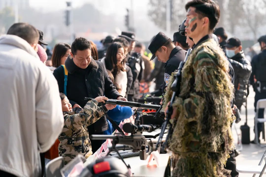 高精度狙击步枪、泰瑟电击枪、警用无人机、警用盔甲服……在驻区特警、巡警装备展示区,平时难得一见的特种警用装备引得不少市民驻足围观,特警、巡警队员们向群众讲解各种装备的用途,并指导群众对部分特种装备进行体验。
