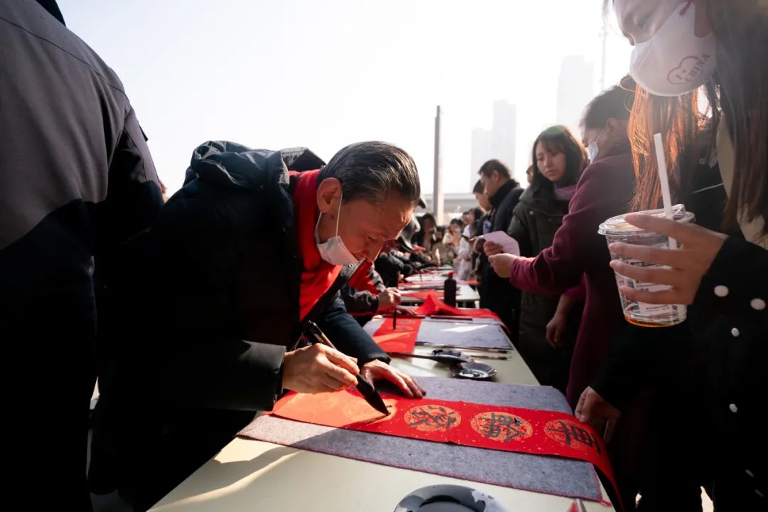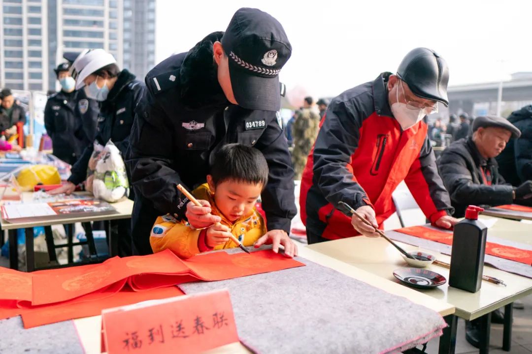 活动现场,10位来自张家湾街道所属社区的民间书法家、爱好者与洪山警营书法高手们笔走龙蛇,一副副苍劲有力的春联,一个个喜庆吉祥的“福”字跃然纸上。