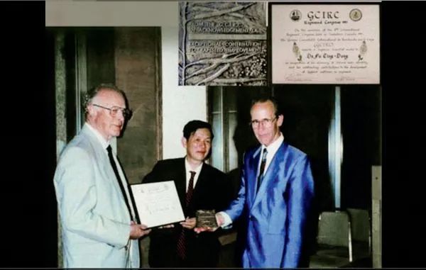 ▲1991年,傅廷栋(中)获得GCIRC“杰出科学家”奖(资料图)