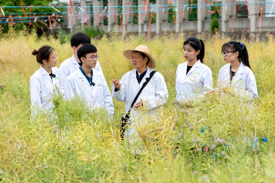 ▲2022年4月,傅廷栋(右三)在华中农业大学的试验田指导学生(刘涛 摄)