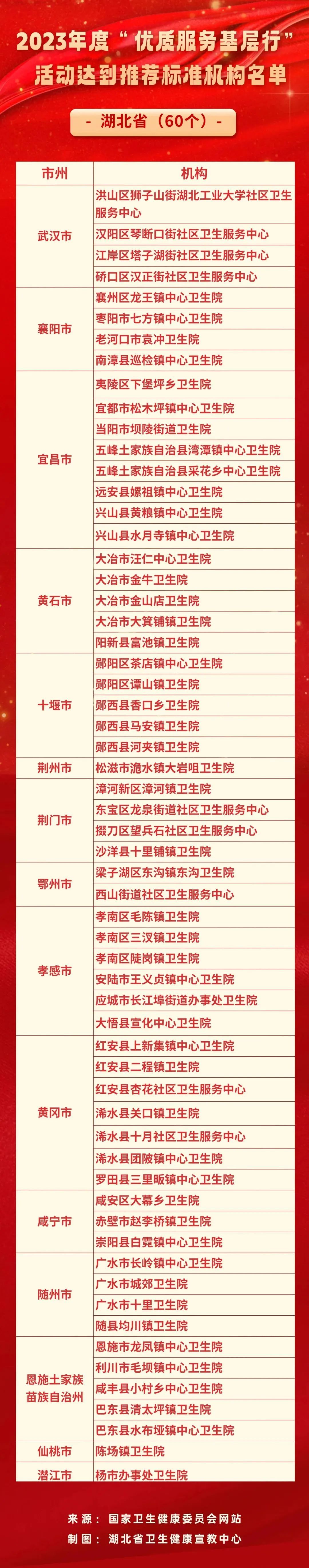 近日,国家卫生健康委发布2023年度“优质服务基层行”活动通报表扬的机构名单,全国共有2427所乡镇卫生院和社区卫生服务中心入围。其中,武汉市4所,洪山区狮子山街湖北工业大学社区卫生服务中心为位列其中。