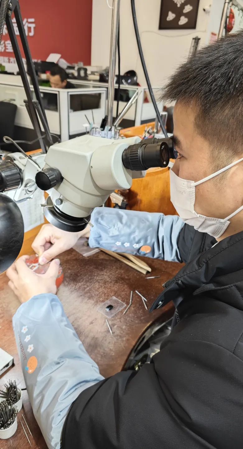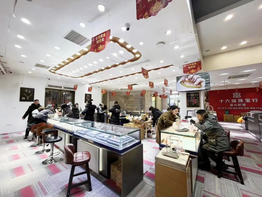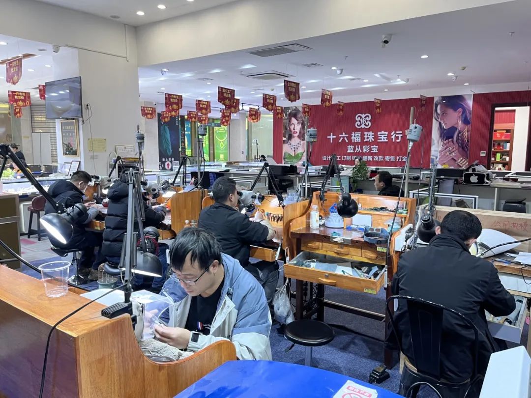 走进鲁磨路中段的武汉宝谷珠宝交易中心,1万多平的经营场地上,分布着大大小小数十家金银珠宝店。其中一家最大的个性化定制铺面“十六福珠宝行”,外面的销售区域客流不断,工作人员热情接待、专业解答;里面的加工区域热火朝天,工匠们精雕细琢、璞石成玉。公开透明的全过程引起了不少消费者的好奇和观望。