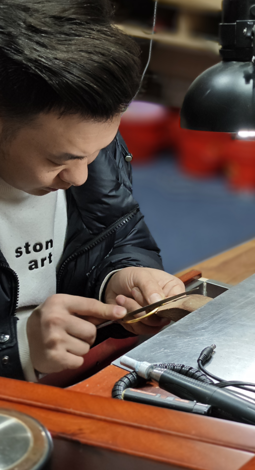 十六福珠宝行注重设计,得益于陈进峰学设计出身以及丰富的个人经历。他们将国际视野融入传统工艺,国潮汉风、故宫元素、楚文化图腾等都是设计师的灵感来源,加上传统工匠的錾刻、镶嵌、打磨、抛光,一件独一无二的金银珠宝饰品就面世了。“除了私人订制,我们还接受加工,由顾客提供金银玉石等原料,我们进行设计制作。这样顾客不仅更放心,而且价格也更实惠。”