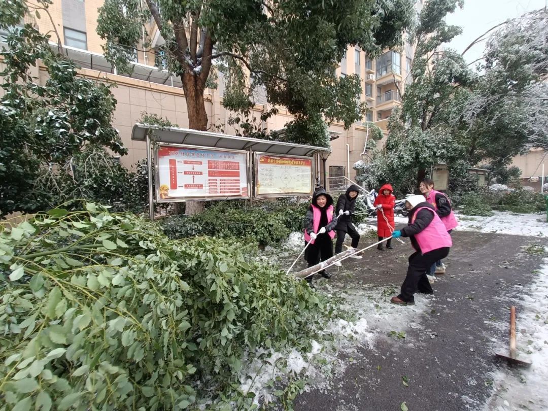 大雪过后,地面一片狼藉,掉落的断枝满地都是。园艺社区巾帼志愿者找来绳索、锯子等各种工具前来帮忙。大家齐心协力,一起把大树枝拖走并清理干净,真真是“巾帼不让须眉”。