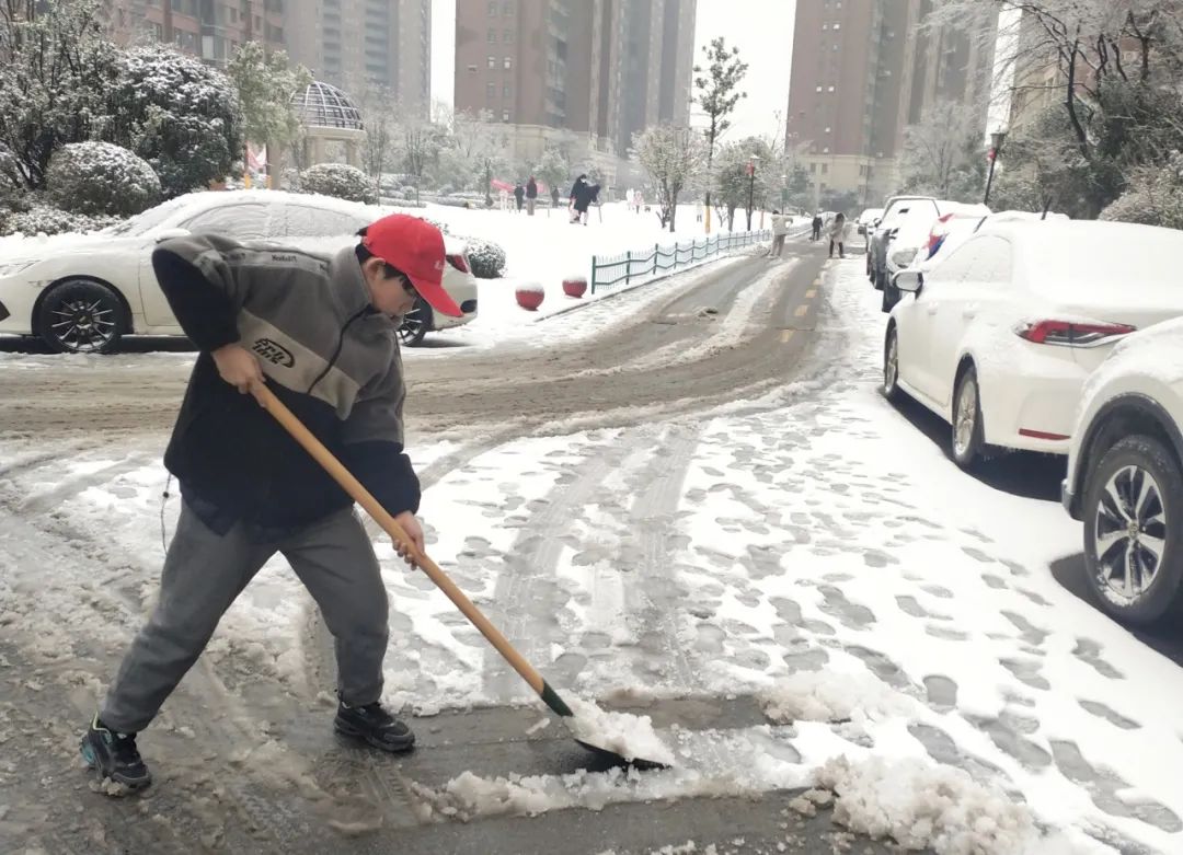 雪一直在下,越来越多的居民自发出门扫雪。2月4日早上,在青菱街道爱家名校华城小区,12岁的王浩初急匆匆地扒了几口早饭,便催着妈妈出门。刚下楼,王浩初熟练地戴上“小红帽”,拎起铁铲就“开干”。