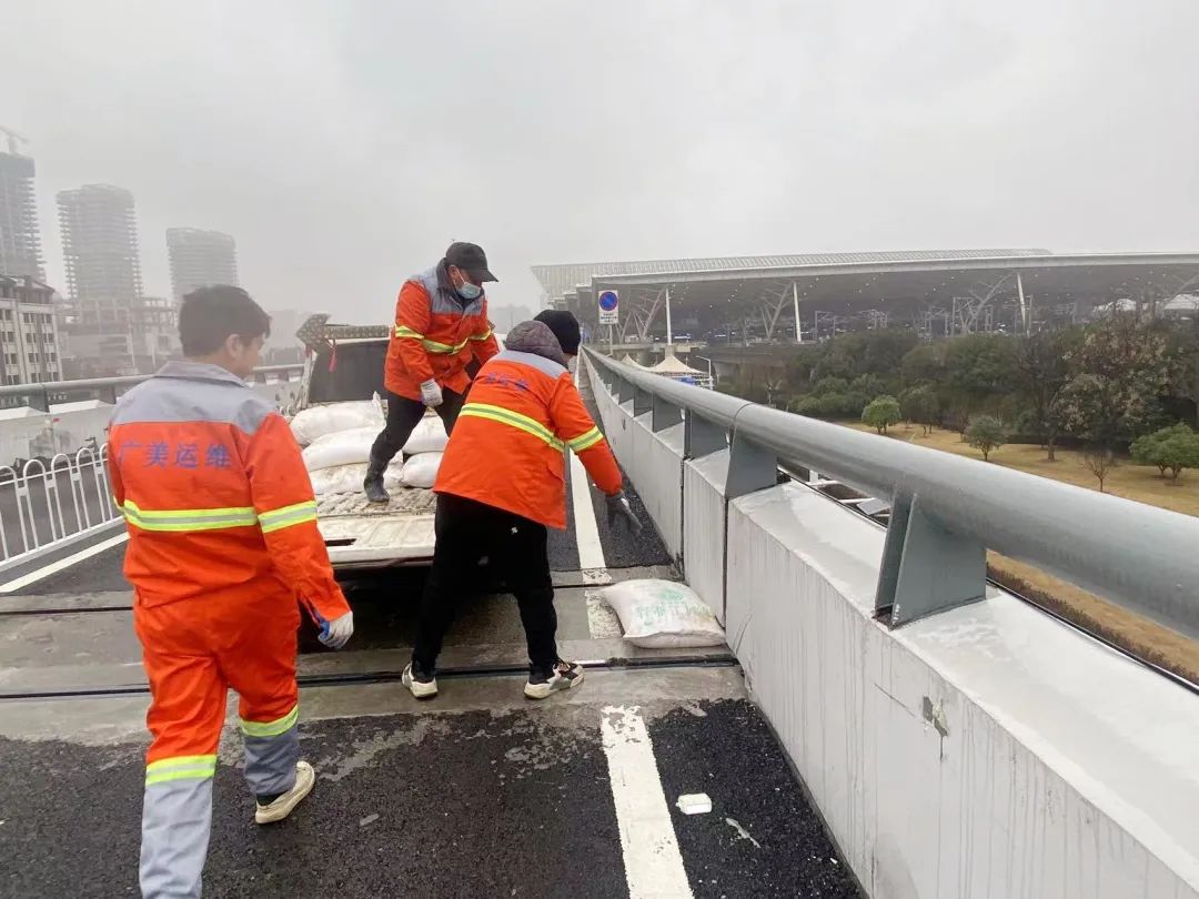 此外,洪山区武汉站地区综管办还在重点路段预置了除雪融冰物资和装备,在夜间出动人员对站区四条主路,东、西高架及各风险点位开展全面巡查,对风口、阴面、坡道易结冰点位进行预撒融雪剂处理,防止路面桥面结冰。