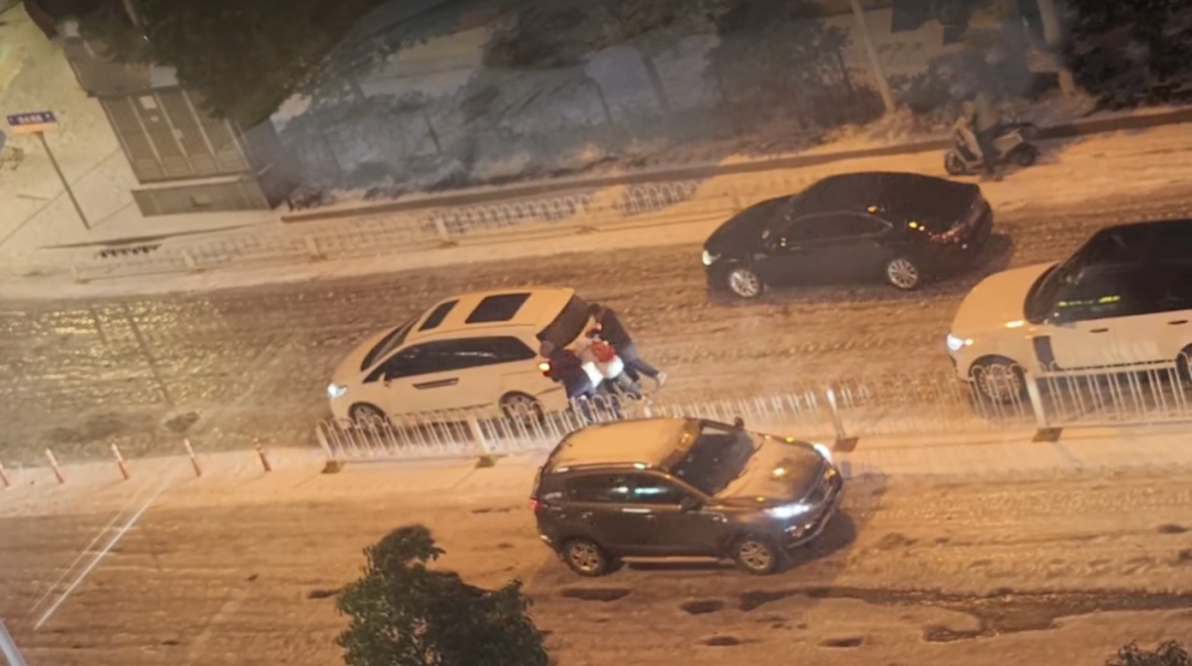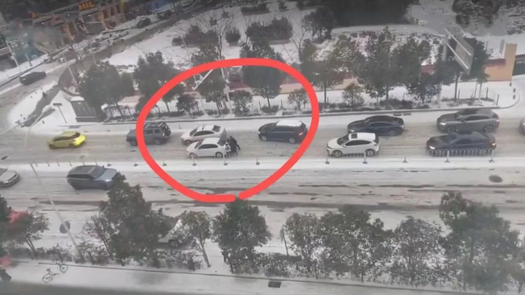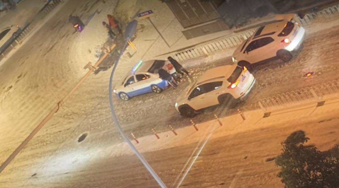 三名少年在雪地里来回穿梭,与路人、司机一起,帮助一辆辆打滑“趴窝”的车辆脱困。在短短两分钟的视频里,三人推了大约10辆车,最多时有6个人一起推车,其中既有私家车,也有出租车。直到路灯亮起,三人还在合力帮忙。