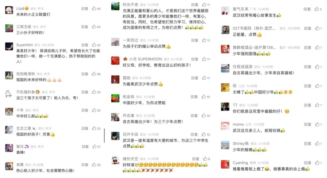三位少年的行为赢得众多网友点赞,网友“牛九一”转发该视频时说:“今晚所有的灯火都是为了照亮他们。”还有网友点赞称:“武汉伢最优秀!”也有网友提醒要注意安全。