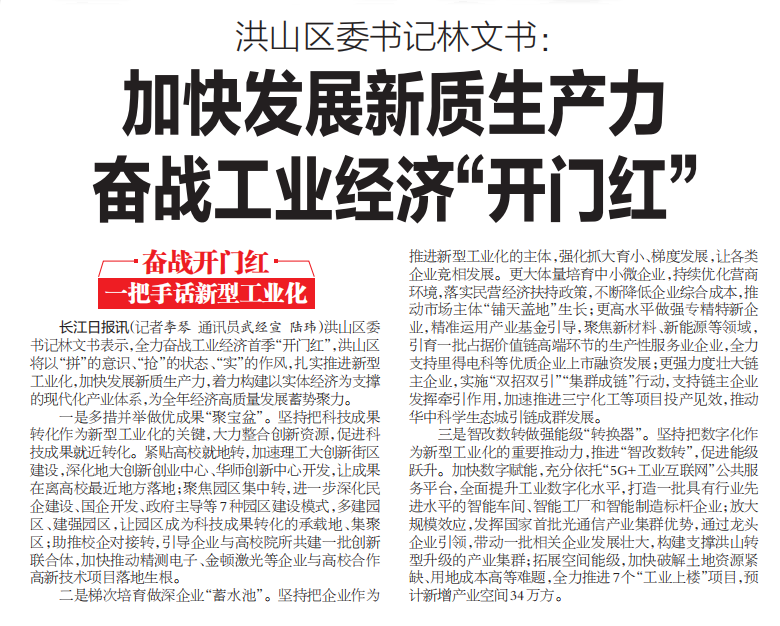 洪山区委书记林文书表示,全力奋战工业经济首季“开门红”,洪山区将以“拼”的意识、“抢”的状态、“实”的作风,扎实推进新型工业化,加快发展新质生产力,着力构建以实体经济为支撑的现代化产业体系,为全年经济高质量发展蓄势聚力。