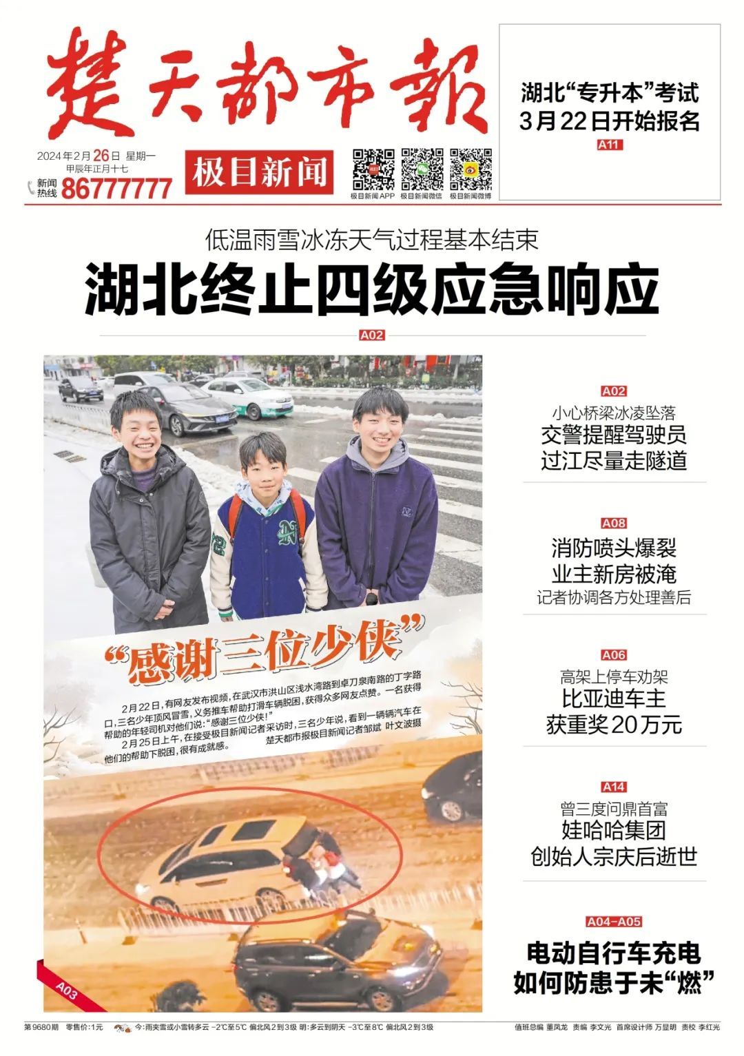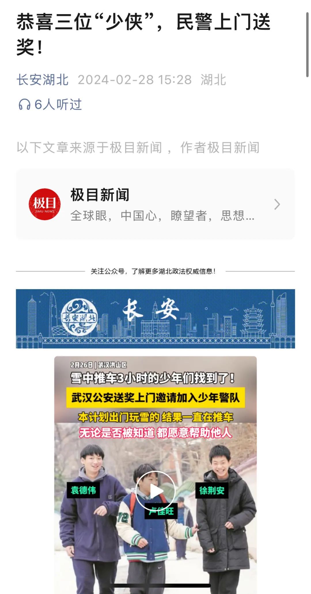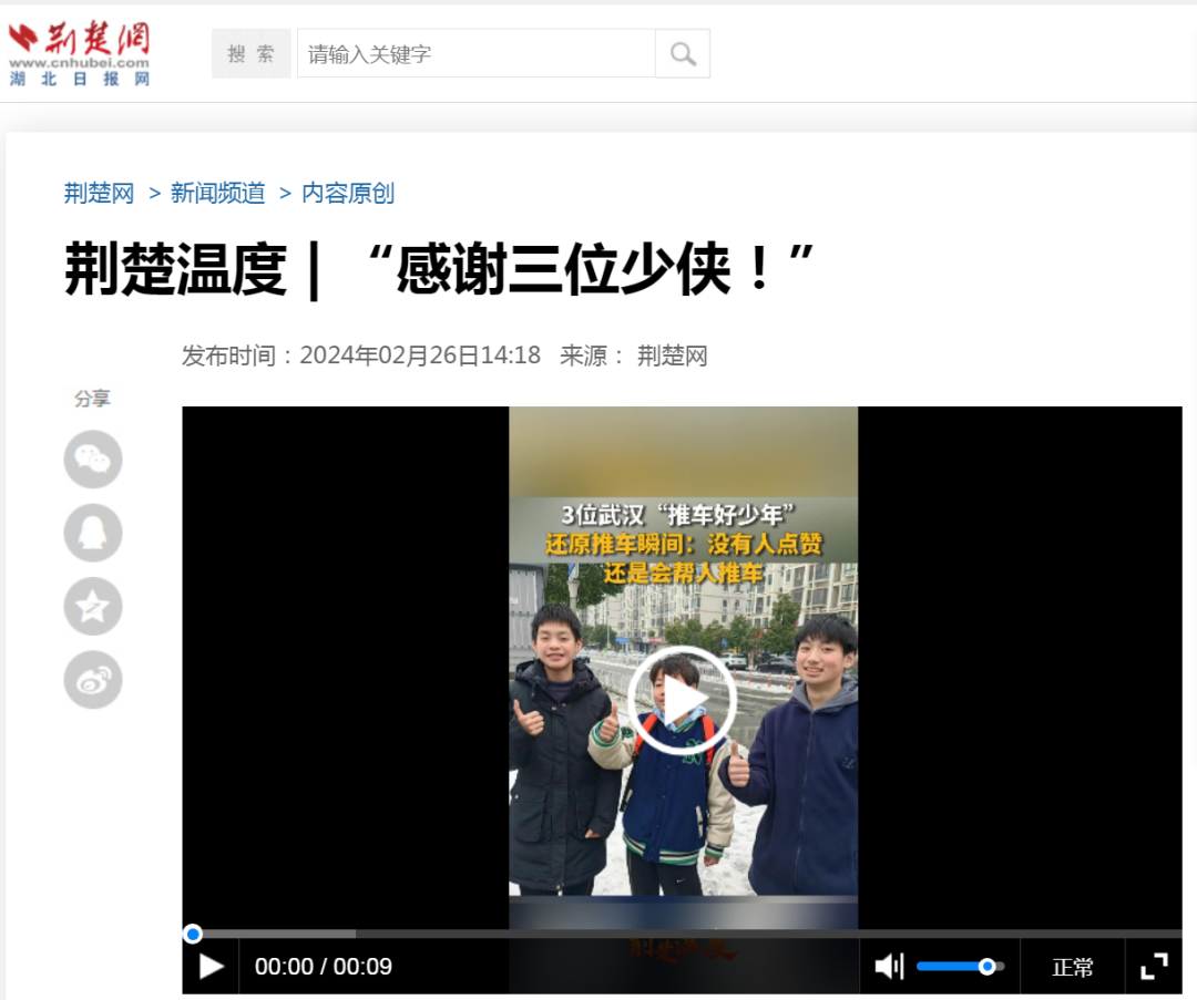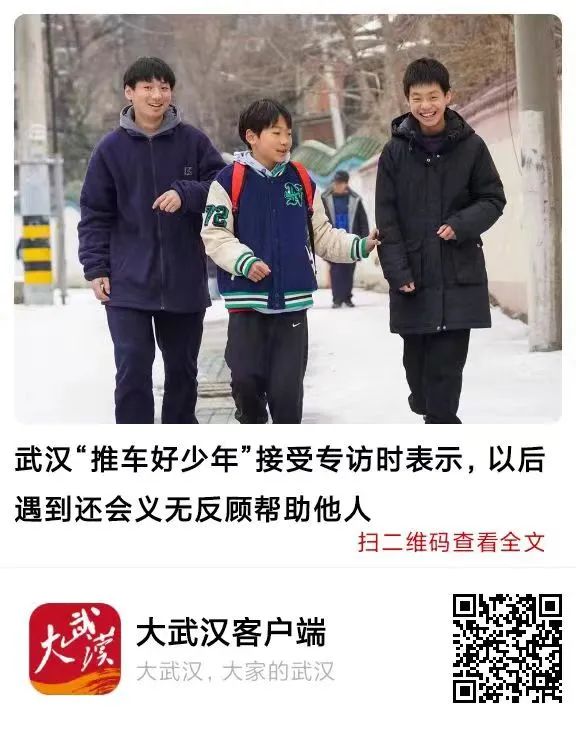 据悉,三位“推车好少年”的事迹由热心网友拍摄视频上传网络,被洪山区融媒体中心联合楚天都市报极目新闻率先发掘,在发布网络寻人信息之后于当晚获得回应。连续两天,楚天都市报极目新闻、荆楚网重点报道,楚天都市报头版、整版聚焦三位好少年以挚诚之爱暖世间人心,武汉发布官方微博、长江日报大武汉客户端、市文明办微信公众号、省文明办微信公众号、省委政法委长安湖北微信公众号、人民网微信公众号等相继转载,省教育厅微信公众号,重点推介,直至这次“生动的开学第一课”再次被中央政法委长安剑关注。“推车好少年”相关报道、话题全网阅读量、点击量达到数百万次,评论互动数超万条,传递了新时代好少年向上向善的强大力量。