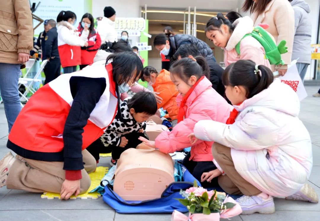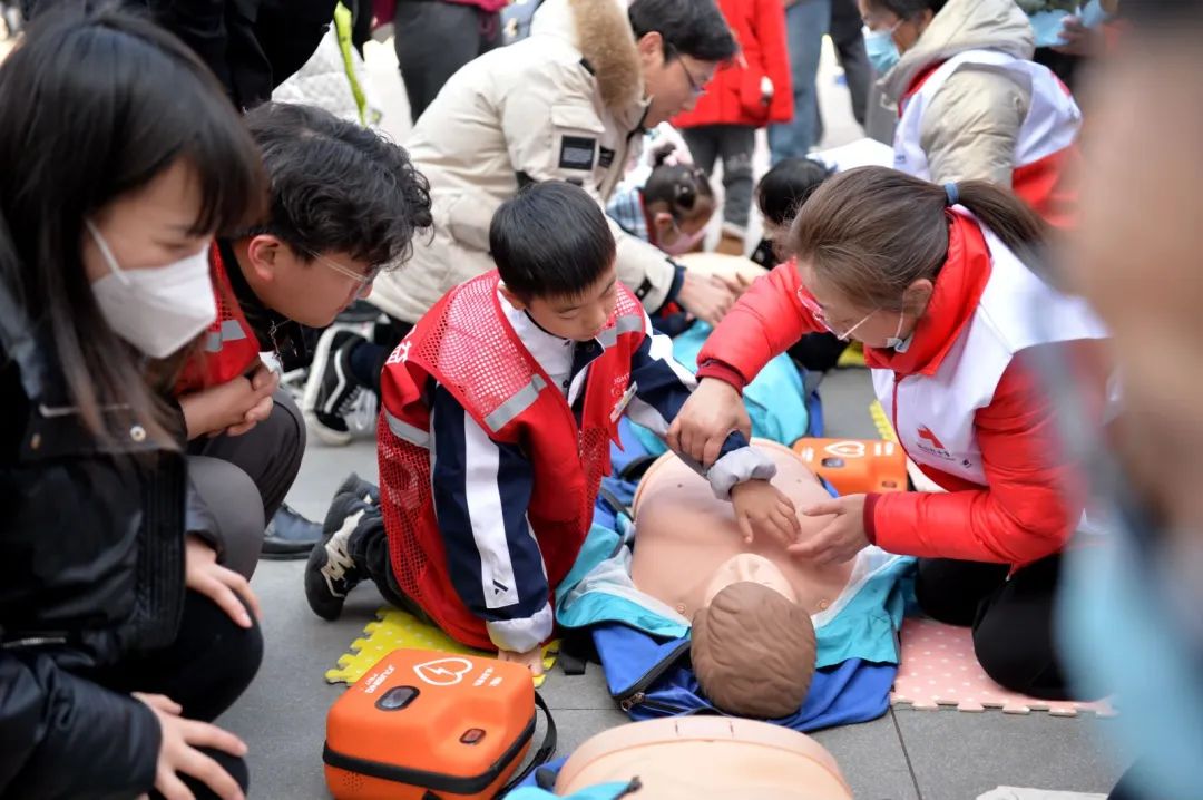 场面最大、最热闹的当属心肺复苏现场教学,道具在广场上一字排开,到场的市民依次排队上前,在区红十字会志愿者的指导下,进行实操演练。