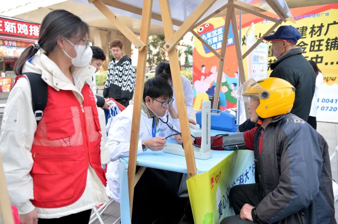 在健康义诊区域,武汉科技大学青年志愿服务总队把健康义诊的设备摆出来,就有居民前来测量血压,咨询心肺复苏急救的方法。