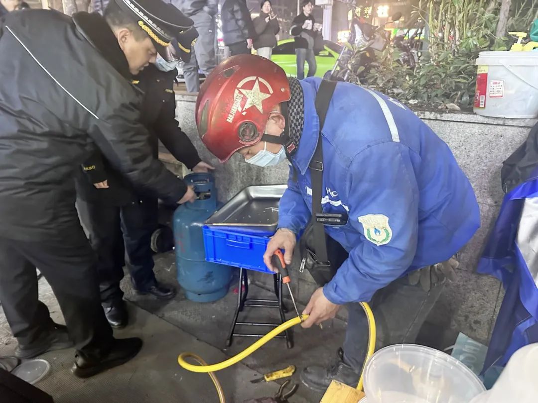 当晚六点半,在“麻辣串串”流动餐车,执法队员发现该处瓶装液化气软管上开设三通接口分流,存在严重安全隐患。检查人员立即向商户表示该处燃气“三件套”使用不当,并立即联系相关燃气公司工作人员,要求立即整改违规行为。