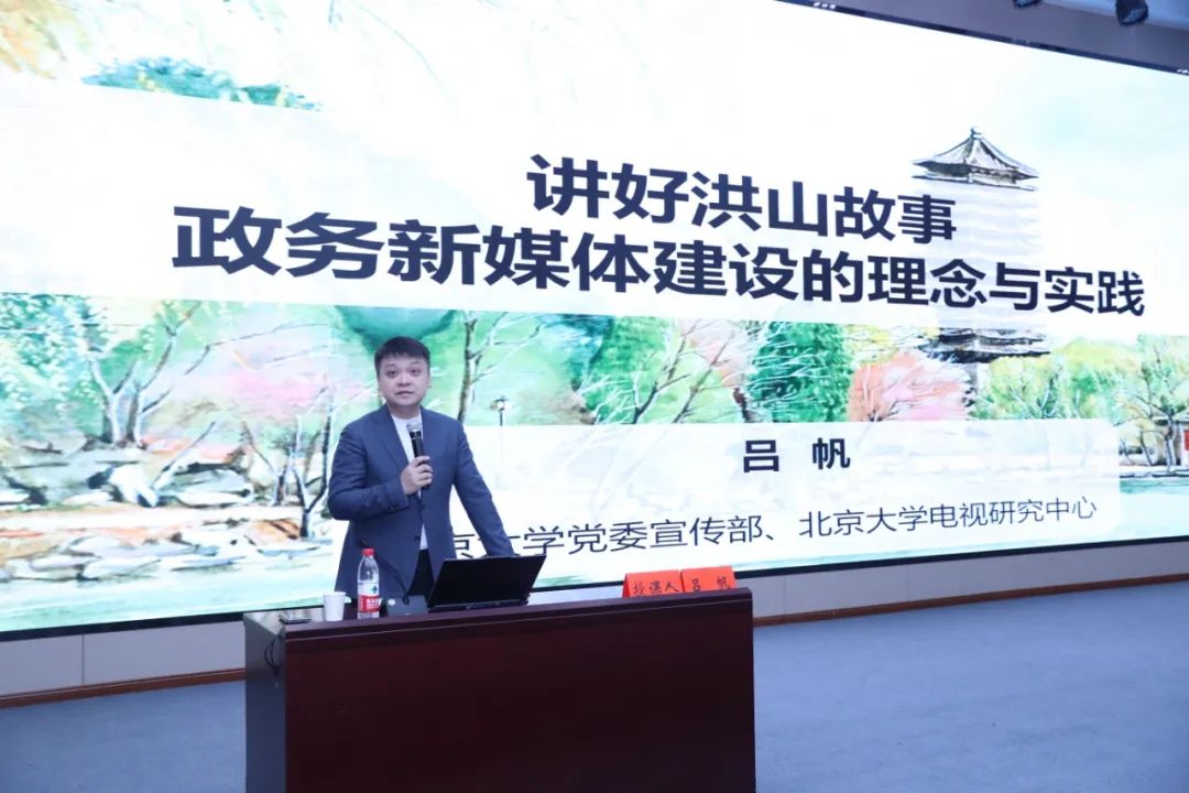 以《讲好洪山故事 政务新媒体建设的理论与实践》为题,在长达三小时的时间里,吕帆博士用深刻的理论基础、丰富的实践案例和幽默的表达方式,指出宣传工作的核心内涵在于表达设计,而表达设计的关键在于故事思维。政务新媒体要善于运用“故事思维”,发现提炼深挖基层故事,不仅要有情感层面的感动,还要有精神层面的撼动,更要有思维层面的触动,才能实现“因我而起 为你而来”的双向奔赴,进而提升吸引力、影响力、传播力。针对实操,吕帆博士支招要重内容、重设计、品牌化、新形式、制热点、跟热点,以心交心,方可长远。