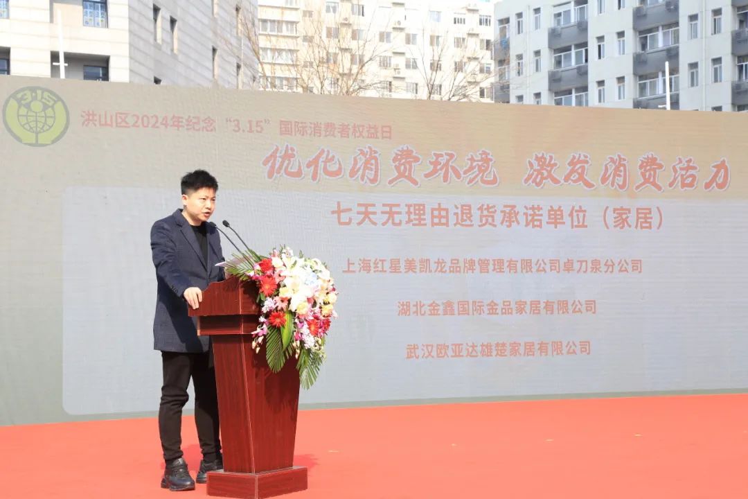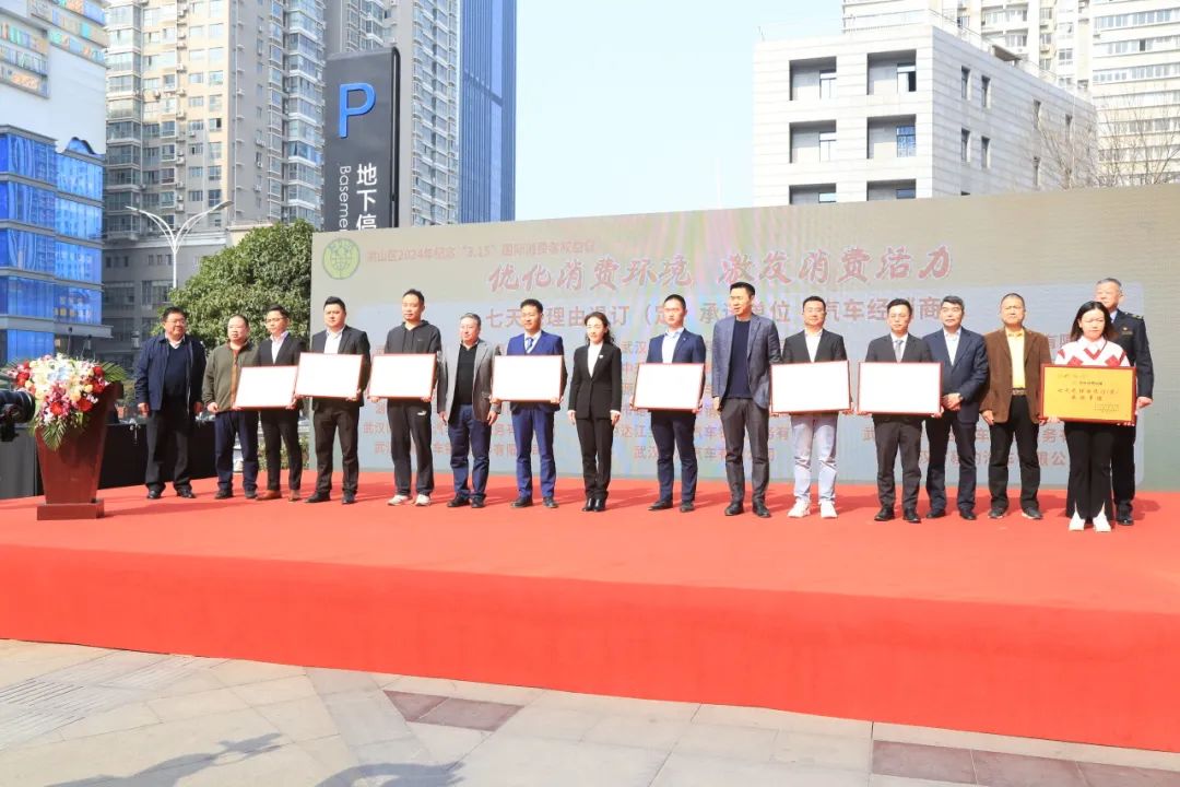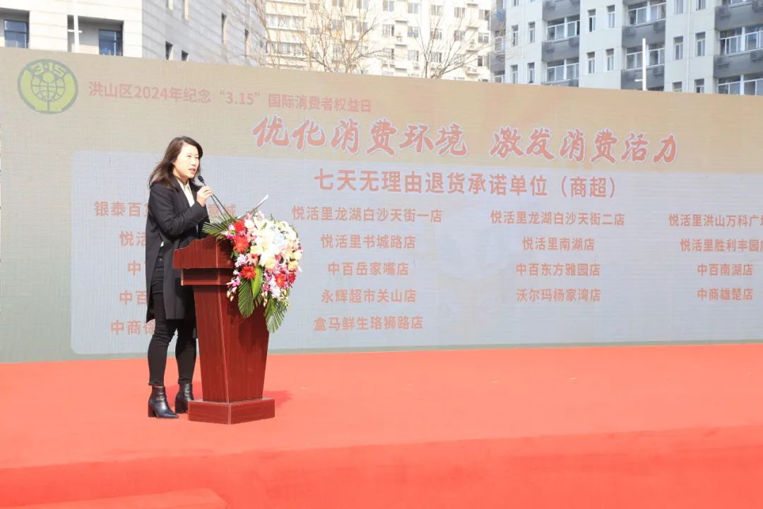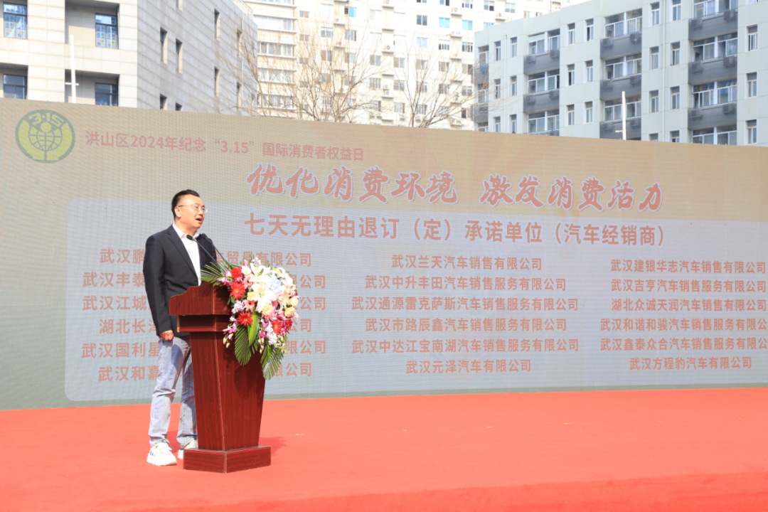 2024年3月15日,是第42个国际消费者权益日。当天上午,洪山区“3·15”宣传暨“放心购车·就在洪山”主题活动在银泰创意城正式启动,全区54家汽车销售企业、18家大型商超和3家大型家居卖场均作出了“七天无理由退货”和“七天无理由退订(定)”的现场承诺。