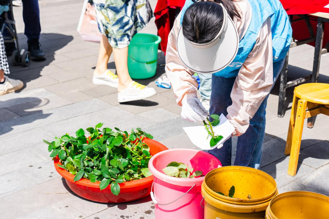 “我是从我女儿那里得到消息的,一早八点就出发,坐了半个小时公交,还好是赶上了。”一位年过七旬的女士说,“这次活动很好,我平时很喜欢在家里种花,这次听说可以领取到优质品种月季扦插枝条,所以特意前来尝试一下。这里的月季不仅品种多,而且养得非常好。我也想在家里种出同款月季。”