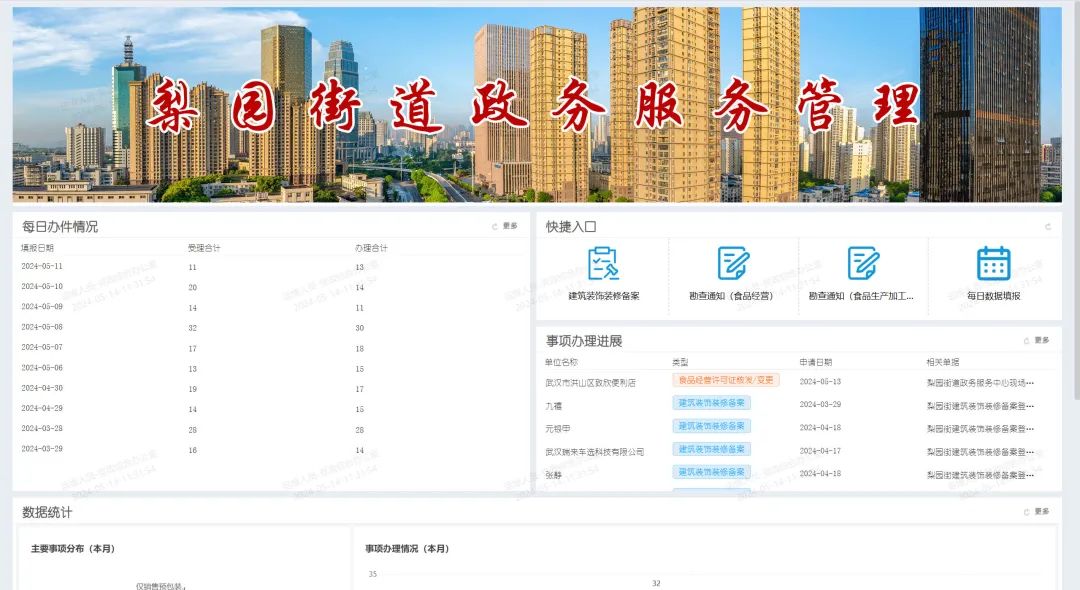 目前,“数字梨园”系统政务服务板块已进入正式运行阶段,共办理食品经营许可事项8件,单件事项平均节省办理时间2小时。依托三方联动模式,极大简化了办件流程,推动了政务服务高效化、规范化建设,并进一步为基层减负赋能。同时,首页还设置了数据统计版块,实现每日办件情况、事项办理进展,主要事项分布等数据可视化,便于负责领导、工作人员实时掌握工作进展。