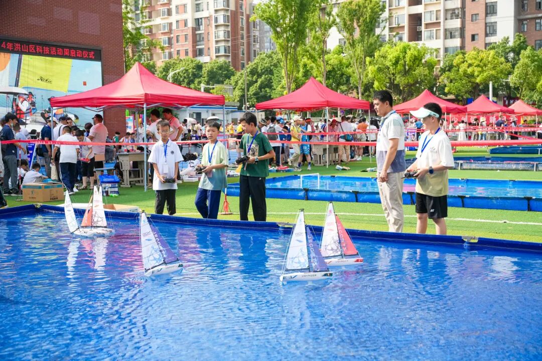 活动现场,科技活动周系列活动武汉市青少年航海模型大赛正如火如荼地进行。孩子们操控着自己制作的船模,在比赛场地中乘风破浪,激烈角逐,在动手动脑的同时,达到启发创新思维、培养科学素养的目的。在浓厚的科创氛围中,与会领导、学校师生共同参观了洪山区科技成果展、洪山区优秀科技工作者展览以及青少年航模展。