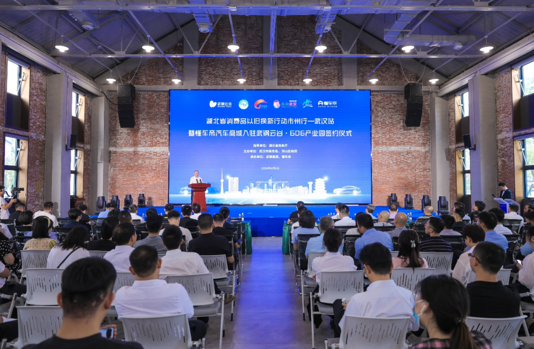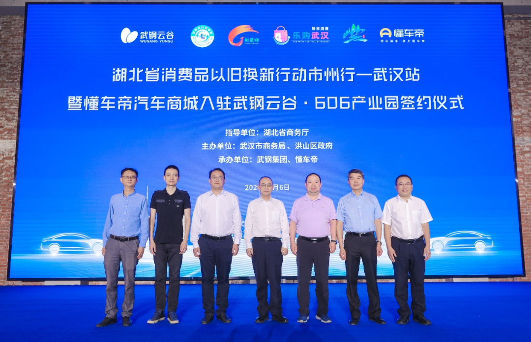 6月6日,湖北省消费品以旧换新行动市州行武汉站暨懂车帝汽车商城入驻武钢云谷・606产业园签约仪式在洪山区举行。本次活动由湖北省商务厅指导,武汉市商务局、洪山区政府主办,武钢集团、懂车帝承办。