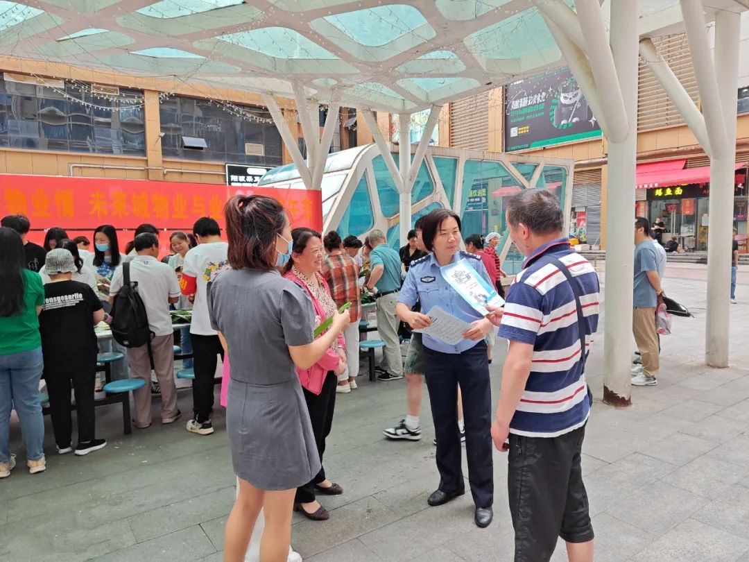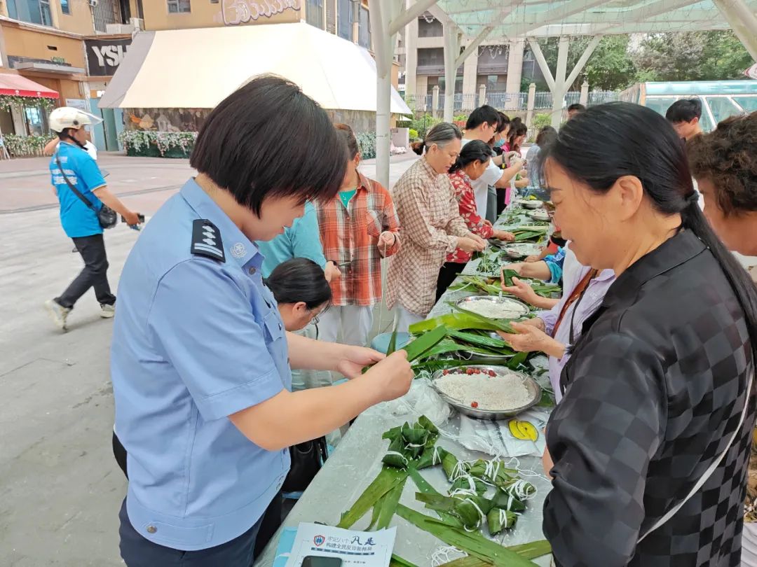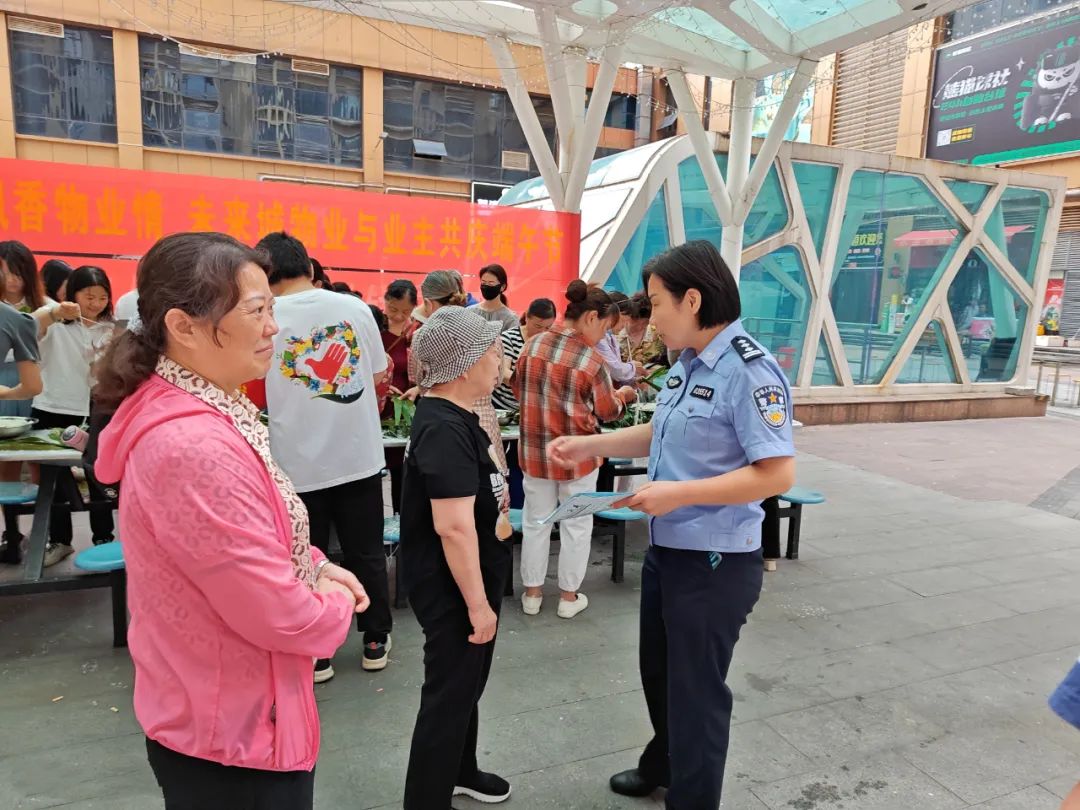 未来城小区物业组织辖区居民开展包粽子活动,社区民警刘建芳带领警务室辅警、社区工作人员受邀参加,同步开展防电信网络诈骗宣传。