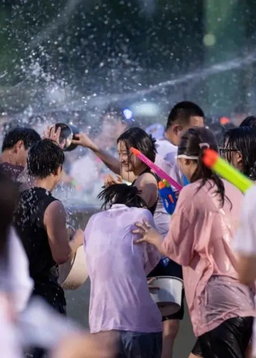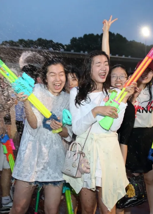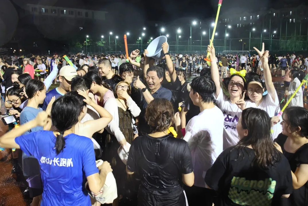 流光溢彩的队伍在校园道路上用脚步丈量狮山,挥洒青春激情与活力;水花激扬绽放,各种“武器”轮番上阵,整个现场成了欢乐的海洋。