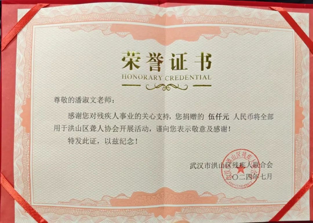 当天,潘淑文老人将5000元奖金捐出,洪山区残疾人联合会负责人向老人颁发了荣誉证书,感谢潘淑文老人对残疾人事业的关心,并向其表示敬意。记者注意到,潘淑文老人特意将5000元现金取出,装在了一个印有“好运连连”字样的红包里面。“没错,这是我精心准备的!我希望残疾人朋友都能好运连连!”潘淑文老人说道。