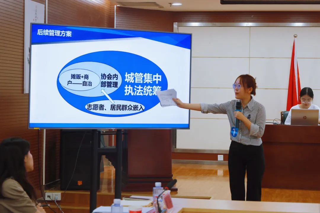 她们认为,可以搭建一个为摊贩和商户提供信息、进行双选的平台,一方面可以畅通信息渠道,另一方面还可以互相引流、增加经济效益。同时,在后续管理中,她们还提出了可以通过“摊贩+商户”自治;成立协会,内部管理;城管外部执法;嵌入第三方力量等多方融合方式,来聆听各方的声音,让社会多元化力量参与到城市治理中。