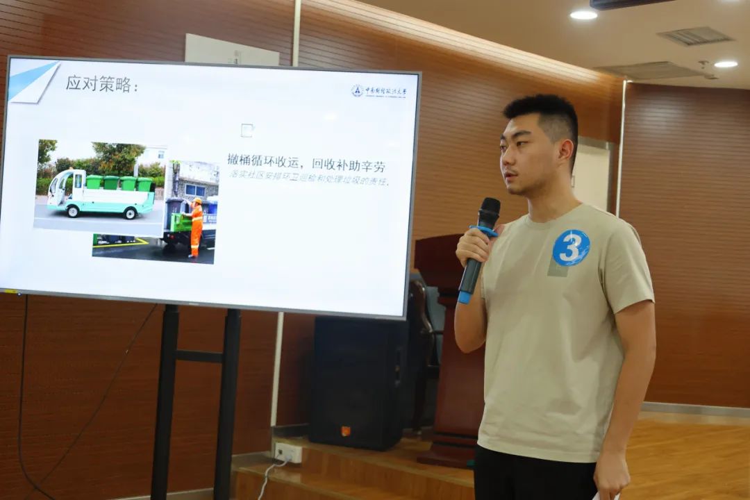 另外两个小组则带来了他们对垃圾分类中撤桶并点、混装混运等具体工作落实的想法。在撤桶并点中,他们提出可以通过“撤桶循环收运,回收补助辛劳、并点搭建设施,租赁广告创收、政策起步过渡,宣传分段跟进”等三个步骤来持续推进社区撤桶并点工作;在混装混运中,他们认为,“落实物业管理主体责任;以智慧环卫实现垃圾分类全过程监督;推行公交式垃圾清运模式;实施督导员以奖代补福利制等措施,或许可以缓解目前混装混运难题。”