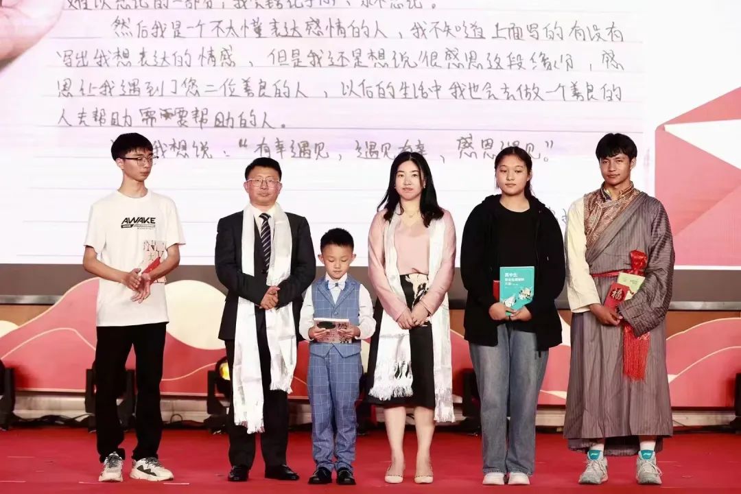 巫世峰夫妻带着孩子和受资助学生代表合影,右为旦增晋扎。