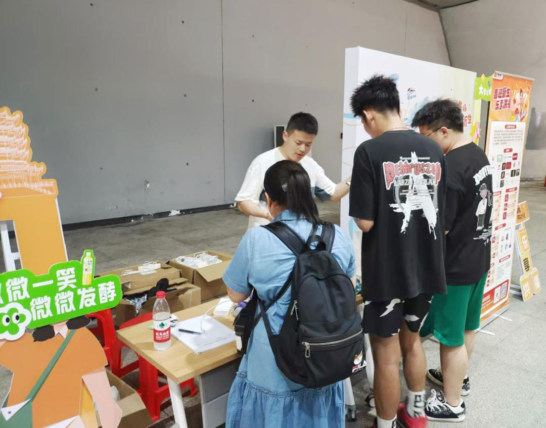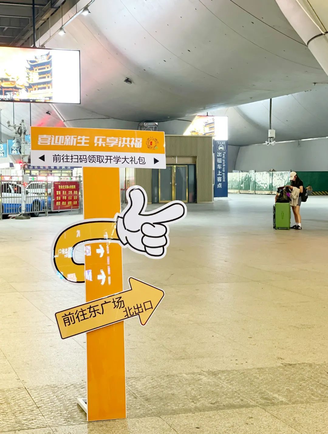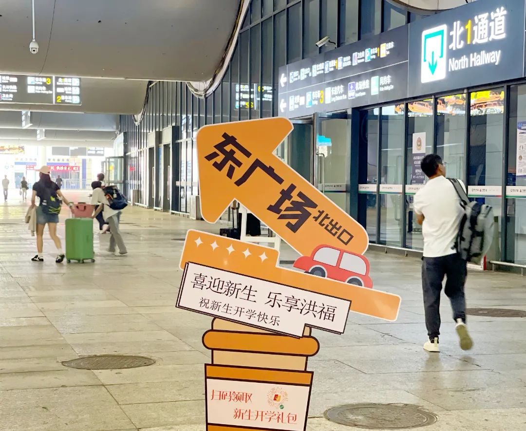 在站内北广场,“乐享洪福”宣传点位格外醒目,摊位前挤满了满怀好奇与期待的“萌新”,大家纷纷掏出手机扫码关注,领取来到大学之城的第一份见面礼。