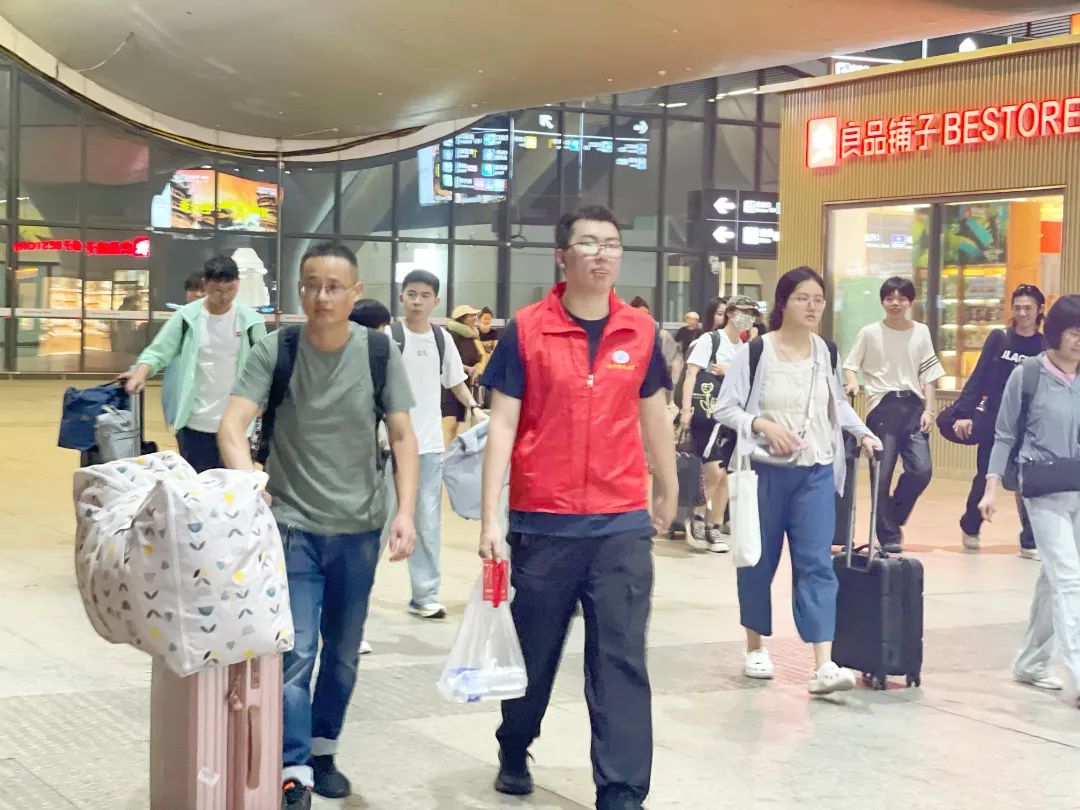 在武汉火车站,身穿红色马甲的志愿者,细心地为新生答疑解惑、指引路线、搬运行李。学长学姐们热情地招呼,领着学弟学妹顺利地找到各自的“组织”。