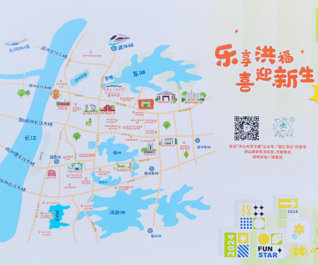 为了帮助新同学尽快地熟悉洪山、了解武汉,洪山区还精心设计制作了大学之城手绘地图,不仅把辖区内35所高校按照地理位置标注出来,还有南湖、野芷湖、黄家湖等山水湖泊、雄楚大道、珞喻路、珞狮路等重点交通节点,黄鹤楼、湖北省博物馆等知名景点也都清晰可见。同学们争相寻找自己的学校,并合影打卡留念。