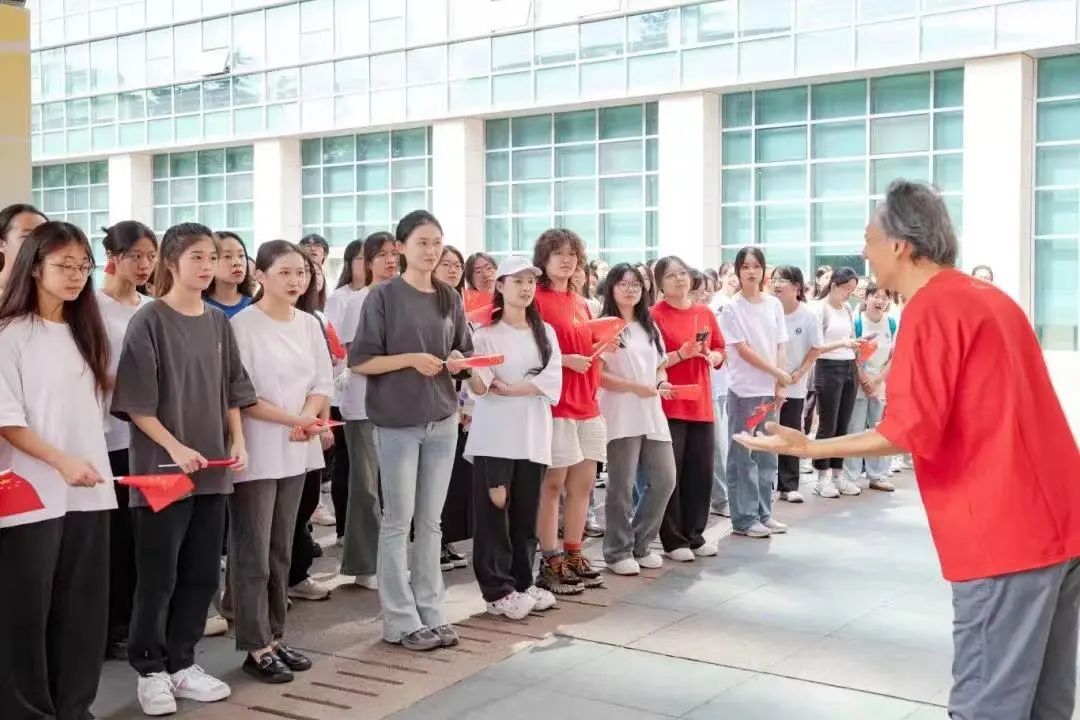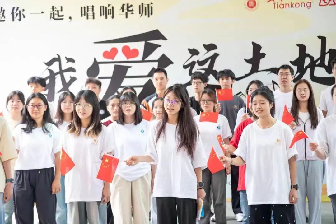 在音乐学院田晓宝教授指挥下,Tiankong合唱团和百余名学生志愿者在图书馆门前分成四个方阵,一曲《我的祖国》拉开了此次活动的帷幕。合唱成员们边歌唱边挥舞国旗,一齐向图书馆门口缓缓汇合。多个声部的歌声此起彼伏,富有层次的歌声带着现场观众飞越壮丽山河,广袤的大地、翻滚的麦浪和流淌的江河好似跃然眼前。嘹亮的青春之声满怀对祖国的热爱与祝福。
