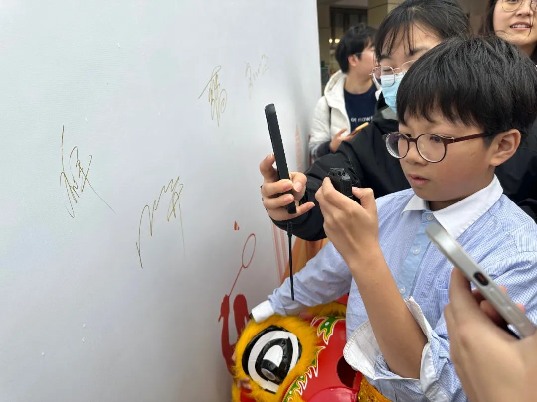 还有不少同学在几位奥运健儿留下签名的签名墙上合影留念。